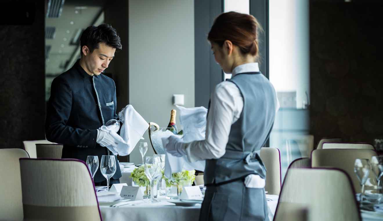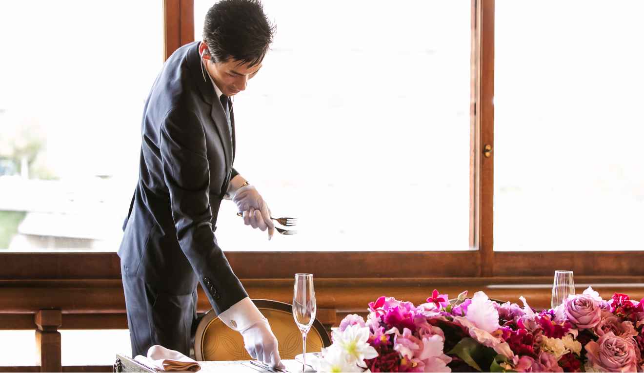 おふたりがどんな思いでその日を迎えられるのか。ゲストのみなさまのためにどんな準備をされてきたのか。私たちホールスタッフ一人ひとりにまで共有が行き届いています。だからこそ、NIPPONIA HOTEL 函館 港町には、ただお料理やドリンクを運ぶためだけに働いているホールスタッフは、当日一人もいません。おふたりの特別な一日をつくるために働いている。そのプロ意識を、ホールスタッフ全員が持ち合わせています。