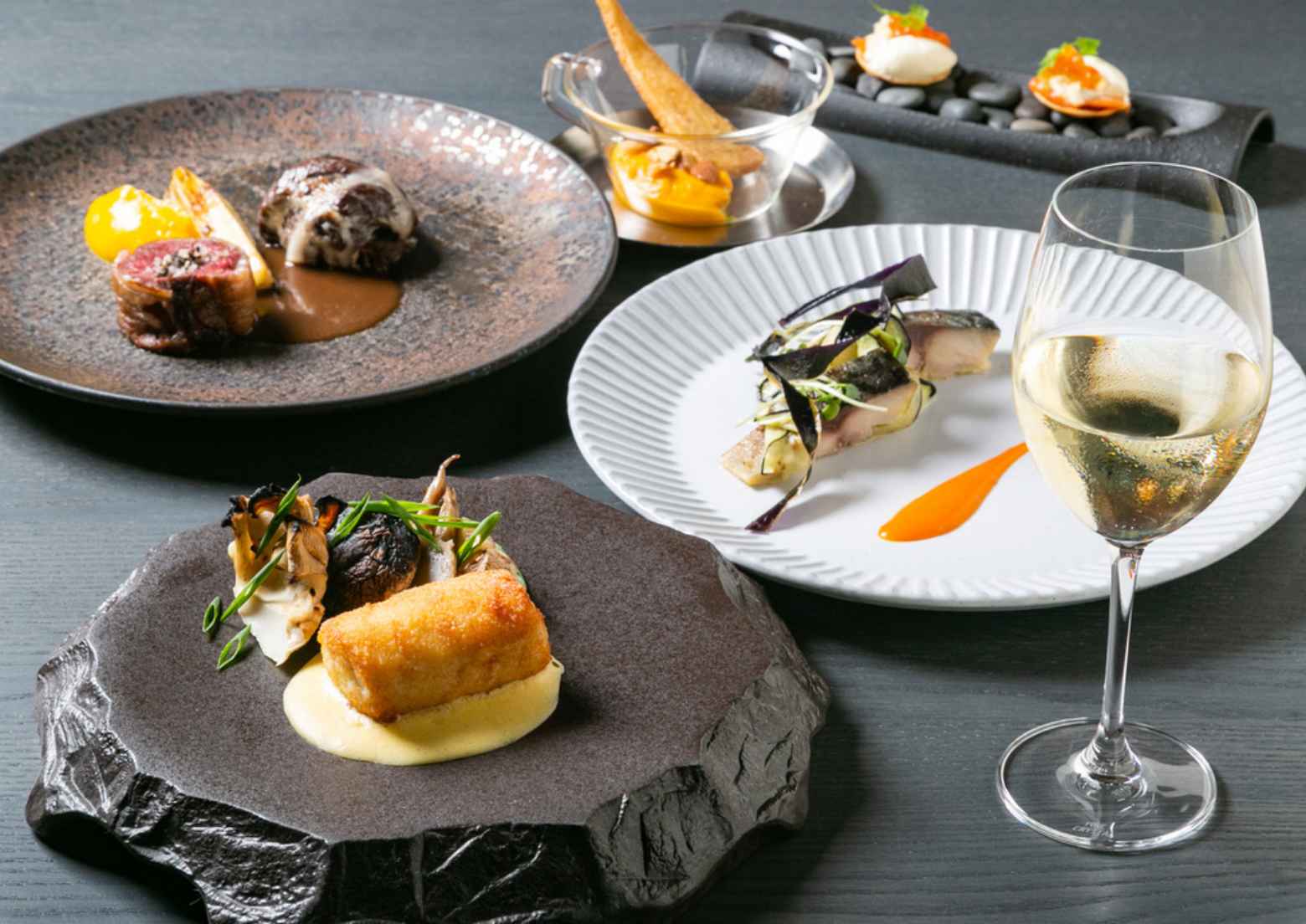 北海道や函館の旬の食材をふんだんに用いた美食の数々。素材本来の味を活かす北欧料理の手法を取り入れ、ここでしか味わえない、至福の一皿に仕上げました。山と海に囲まれ自然に恵まれた函館の恵みを、心ゆくまでご堪能ください。