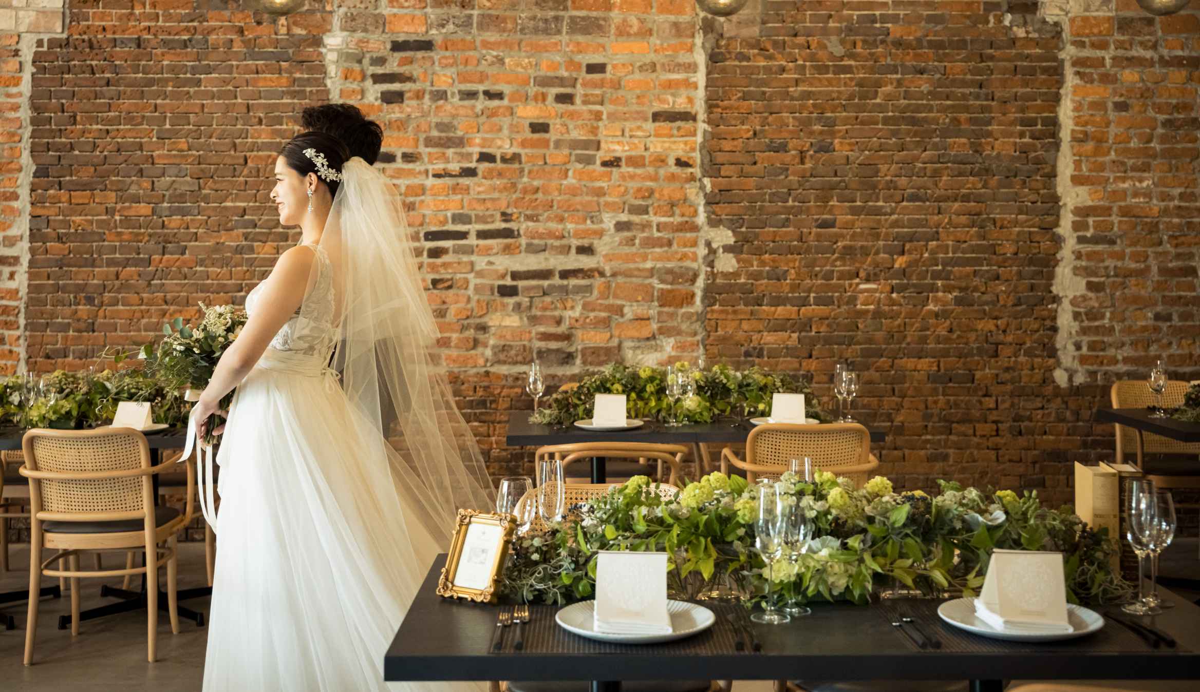 重厚感溢れる赤レンガの風合い、高い天井、きらめく照明、随所に感じる倉庫の名残。特別な空間をふたりと大切なゲストで貸切って、アットホームなひとときを。