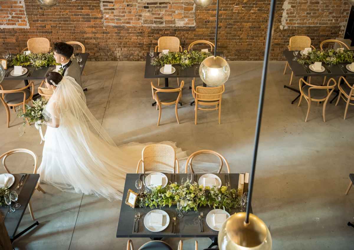 重厚感溢れる赤レンガの風合い、高い天井、きらめく照明、随所に感じる倉庫の名残。特別な空間をふたりと大切なゲストで貸切って、アットホームなひとときを。